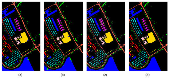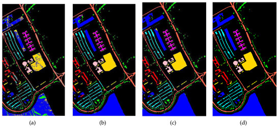 Result of the spectral spatial feature fusion on the Pavia University dataset. (a,b) show the classification results of spectral and spatial features, respectively. (c) shows the result of spectral–spatial fusion feature and (d) displays the groundtruth.