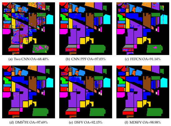 Figure 10 and Table 7 show the classification performance of the six methods on Indian Pines, the experiment were repeated ten times. Figure 10 demonstrates the classification result of each pixel, we can see that of the MDSFV method is closer to groundtruth, and the rest of the methods have more or less mis-segmentations of some regional edges. Table 7 shows the average accuracy and standard deviation per class. Distinctly, our methods are more optimal in terms of various class accuracies. Since CNN PPF selects three different spectral curves in one class and pairs them with other classes, the number of training samples in the ninth class should be 2, so we set the number of samples of our ninth class 3. When comparing with Two CNN method, we did not train and migrate the model on similar datasets. Therefore, the accuracy of this method is significantly lower than the other methods, which also confirms that the training of deep learning networks using hyperspectral data needs a data foundation. The impact of the reduced sample size on the accuracy is enormous. In general, our method achieved an overall accuracy of 98.78%, and DSFV refers to the classification result without skip-layer feature fusion. It can be seen that using multiscale features can improve the recognition accuracy. The comparison to other methods shows it is superior to other deep learning methods.