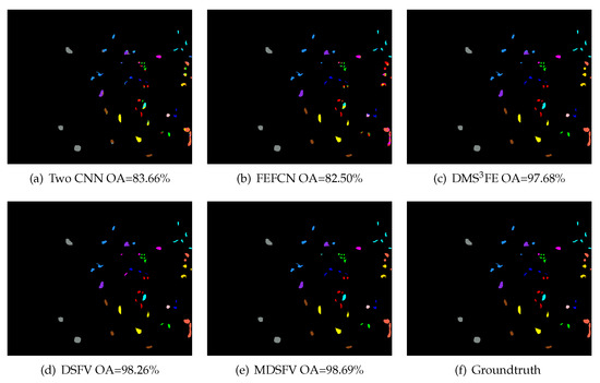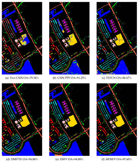 Figure 11 and Table 8 show the classification result of various methods on the Pavia University dataset. From Figure 11, it can be seen that except for the MDSFV method in this paper, the other methods have serious segmentation errors in the meadows. It should be noted, the result of the deepest feature upsampling (DSFV) is inferior to that of DMSFE proposed in [47]. This may be due to the upsampling multiple of the spatial feature is 32, which means that the feature is inaccurate within the range of 32 pixels. But in general, our method performs well in terms of accuracy to the existing deep learning methods. Table 8 shows the accuracies per class. In the class which has major samples, MDSFV performances significantly better than the others. In terms of overall accuracy, it exceeds the DMSFE method by 0.7 percent.