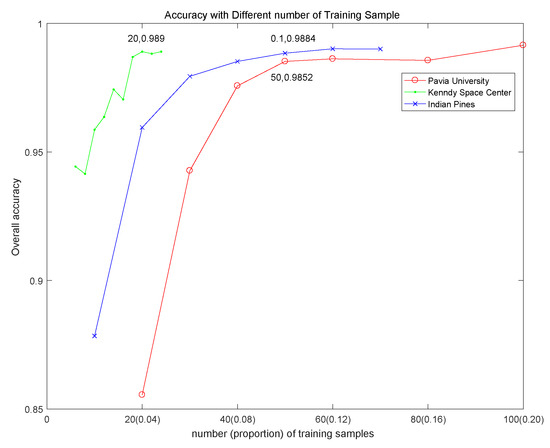 For the KSC dataset, the number of samples per class is small and relatively balanced, so we select the number of samples per class, and the overall accuracy of classification varies with the number of samples per class as shown in Figure 13 by the green line. It can be seen that the initial improvement of the classification accuracy with the training samples is very obvious. When the number of samples per class is 20, as the number of samples increases, the classification accuracy rate increases slowly, so the final sample size is 20 per class.