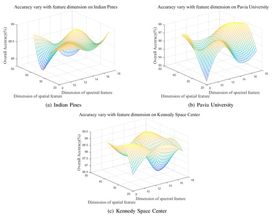 In the process of spectral–spatial feature fusion, the spectral features are obtained from the original spectral PCA, and the spatial features are obtained by combining the first few dimensions of the principal components after the spatial feature PCA. The dimensions of both can be changed, i.e., in Equation (7) , is changeable. We performed the experiments on three datasets and combined the results of them to obtain the final spatial and spectral feature dimension. The results on the datasets are shown in Figure 14.