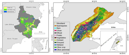Cropland maps of Ninh Thuan, Vietnam [34] (left) and of Bekaa, Lebanon [35] (right).