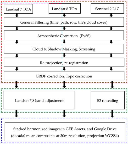 We summarized the workflow into three main steps: (1) pre-processing, (2) sensors harmonization, and (3) post-processing as illustrated in Figure 2. In the pre-processing step (red dashed line), we converted the TOA images to surface reflectances (SR) also known as bottom-of-atmosphere (BOA) using one AC model, exclude images that have greater than 30% cloud coverage over the studied area, then mask out all identified cloudy pixels. We applied the AC model via Python API, all the other tasks were Code Editor based. Because the BRDF and topographic correction models require digital elevation model (DEM) data, they are applied only when the images had been coregistered. The harmonization step (green dashed line) refers to re-projection, re-scaling, and re-alignment (co-registration) of the L7, L8 and S2 images. Finally, the post-processing step (blue dashed line) stacks all the harmonized images into a database of the GEE assets. This step also calculates composite images (mean) of every 10-day period (dekadal) and exports them to Google Drive, making it a shareable geospatial dataset for non-GEE users. The GEE scripts used in the study and links to the generated harmonized datasets that contain the SR images (bands blue, green, red, nir, swir1, swir2, and ndvi at 30 m) over both areas can be found in the Appendix A.