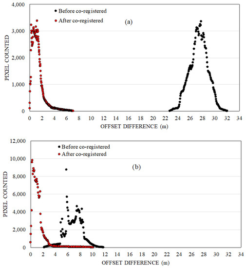 Offset differences per-pixel between L8 and S2 in the tested areas: (a) Bekaa, Lebanon and (b) Ninh Thuan, Vietnam, measured by the magnitude of the vector formed by dX and dY. The black dots represent the offset distances between the original images of L8 and S2, while the red dots represent the offset distances when the images were co-registered.