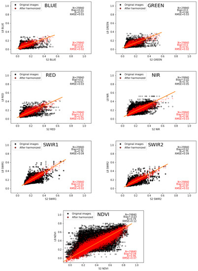 Scatters plots of all seven bands per pixel (blue, green, red, nir, swir1, swir2, and ndvi) for the flat domain in Bekaa, provided N (total number of the pixels), r, bias, and RMSE (Root Mean Square Error). The black and red dots represent the images before and after the overlapped L8-S2 images were harmonized.