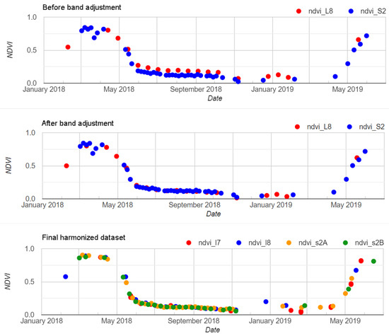 Claverie et al., (2018) [11] followed several steps (Bidirectional a Reflectance Distribution Functions (BRDF) correction, sensor co-registration, bands re-scaling, and re-projection, as well as small band adjustments) to reasonably stack the multi-sensor images to perform a consistent time series analysis.