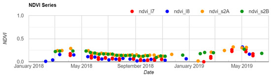 Recently, there is an increase in the number of medium spatial resolution Earth observation (EO) satellites. Since 2013, NASA launched Landsat 8 (L8), which is currently operating alongside Landsat 7 (L7). The combination of L7 and L8 generates three to four observations per month. Since 2015, Sentinel 2 (S2) constellation from the European Space Agency (ESA) has been providing global scale imagery within 5 to 10-day revisiting time at 10 to 60 m resolution. The proven compatibility between L7, L8 and S2 bands enables the opportunity for monitoring at near-daily medium resolution by merging their observations [11,19,20].
