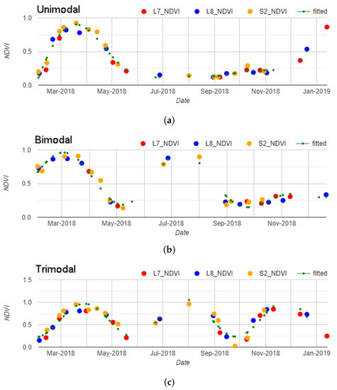 Detected unimodal (a), bimodal (b) and trimodal (c) shapes in the temporal NDVI patterns of different paddy rice areas in Ninh Thuan during 2018. The fitted values (smaller green dots) were used to calculate the phase and amplitude of the cycles.