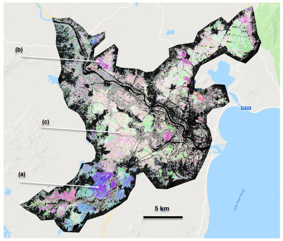 Cropland variation characterized by a R-G-B false composite images from amplitude, phase (of the first harmonic term), and max-NDVI values. This map highlighted the croplands in Ninh Thuan during 2018 as colored pixels (high phase and amplitude) and other types of land as grey/dark pixels (low phase/amplitude). (a–c) are regions corresponding to the unimodal, bimodal, and trimodal time series presented in Figure 8.