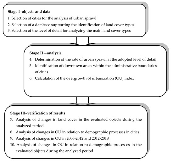 Due to complex data acquisition methods, research into urban sprawl is conducted in selected urban units and conducted over long periods of time. In studies of the type, data collection and analysis are time-consuming processes. In an attempt to develop new tools for monitoring uncontrolled urban sprawl on the national scale, this study proposes a procedure for calculating the overgrowth of urbanization (OU) index (Figure 2).