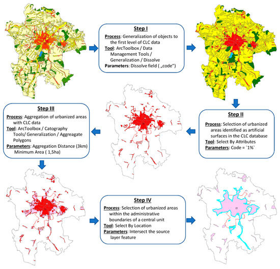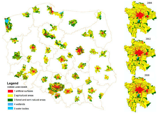 Analyses of changes in land cover offer the simplest and the most rapid approach to measuring urbanized areas [55]. Land cover data are increasingly available from spatial databases and they can be rapidly processed with the use of GIS tools. These resources make analyses of urban sprawl less time consuming and they support analyses of a large number of cities, thus creating new sources of information for evaluating the extent and character of the evaluated phenomenon [56]. In this study, data for analysis were obtained from the CORINE Land Cover database. The analyzed data were generated by remote sensing. CLC data were processed by integrating remote sensing data in a mixed approach combining automatic methods and interpretation tools for digital image analysis. The processed data were Landsat TM multispectral satellite images and aerial images [57].