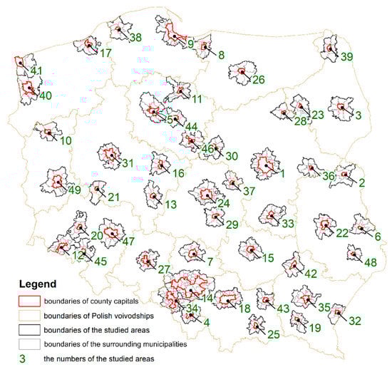 The analyzed areas, including the boundaries of 49 cities and the surrounding municipalities, are presented on a map of Polish voivodships in Figure 4.