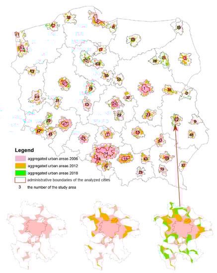 Areas featuring individual buildings or temporary structures were thus eliminated from analysis. Areas that overlapped cities were identified, and urban areas that were directly linked to cities were identified in the last step. The above procedure was repeated for 2012 and 2018 data. The urban areas aggregated based on 2018, 2012, and 2006 data are presented in Figure 6. A clear increase in urbanization can be observed in the analyzed cities.