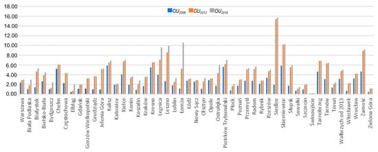 In the analyzed cities, the OU index in 2006, 2012, and 2018 was determined in the following range of values: