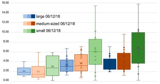 The distribution of the increase in the analyzed values is presented graphically in Figure 11. The smallest changes in population were observed in small cities where the median value of OU reached 0.05 and the values between the first and third quartile ranged from 0.05 to 0.36. Much greater changes in population with more diversified median values were noted in large cities in 2006–2012, where the increase in the OU indicator was smallest relative to the remaining demographic classes. The values of OU were also clustered near the median value (0.65) and the values between the first and the third quartile ranged from 0.54 to 3.42. The smallest increase in population (median: 0.48) with a large number of outliers (range of values between the first and third quartile: −0.80 to 1.35) was observed in medium-sized cities which were characterized by the highest increase in OU values (median: 1.08) and similar change trends (range of values between the first and the third quartile: 0.35 to 1.99, without outliers). In small cities, the increase in OU was higher (median: 0.76; range of values between the first and the third quartile: 0.33 to 1.48, without outliers) and more stable than the increase in population (median: 0.77; range of values between the first and the third quartile: 0.025 to 1.26, with a large number of outliers).