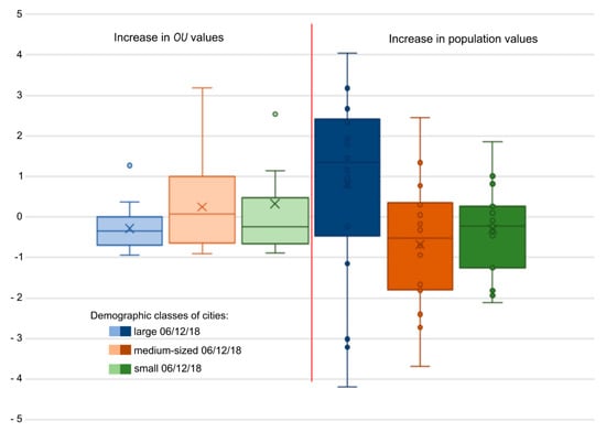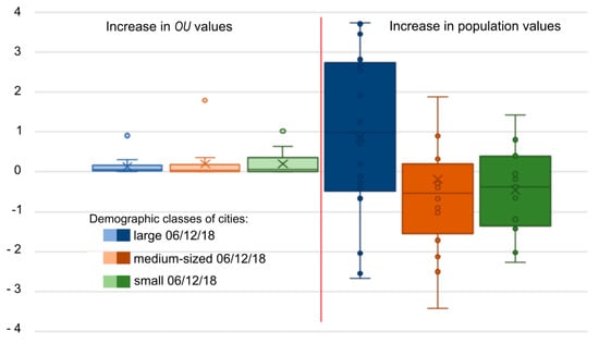 An analysis of the increase in OU values and population in 2012–2018 produced somewhat different results. These changes are presented graphically in Figure 12. The increase in OU values in all demographic classes was close to zero, and significant variations were not observed. The greatest variations in OU values were noted in small cities, where the median reached 0.05 and the range of values between the first and the third quartile was determined at 0.05 to 0.36. The population increase in 2012–2018 was much greater and more diversified relevant to the median. The observed trends were similar to those observed in the previous period. The greatest differences were noted in large cities, where the median reached 0.98 and the range of values between the first and the third quartile was determined at −0.49 to 2.73. Population increased at a much slower rate in small cities, where the median reached −0.54 and the range of values between the first and the third quartile was determined at −1.54 to 0.19. The smallest, but the most varied increase was observed in medium-sized cities where the median reached −0.38 and the range of values between the first and the third quartile was determined at −1.36 to 0.40, with a large number of outliers.
