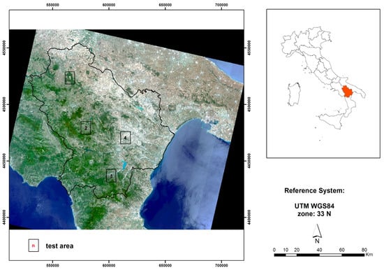 The study area is located in the Basilicata region, in southern Italy (Figure 1). The Region can be considered representative for the Mediterranean area due to both climate and vegetation characteristics. In particular, the area is characterized by both a Mediterranean humid-type climate in the Apennine Mountains, and a Mediterranean dry-type climate in the hilly and flat areas. Forest vegetation covers 35.6% (355,367 ha) of the total area, represented by deciduous oak forests (51.8%), beech forests (8.4%), Mediterranean Macchia (7.9%), shrublands (6.9%), and other deciduous broad-leaved forests (5.5%) [42].