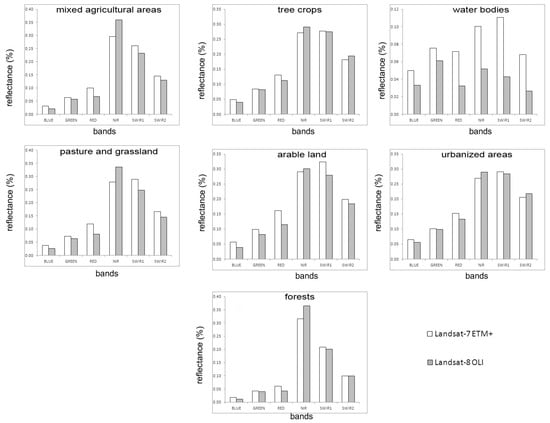 OLI and ETM+ bands reflectance values for land use classes.