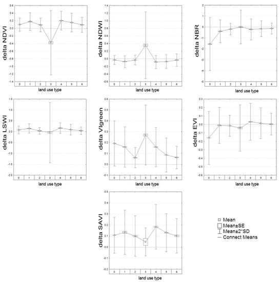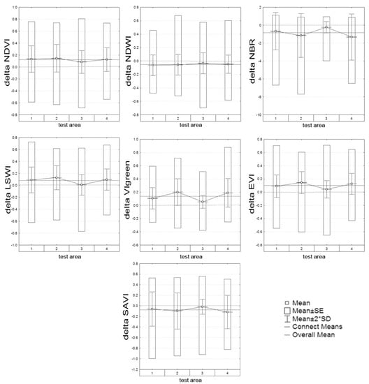 The results of the analysis of the difference variability between the vegetation indices for each of the test area and for each land use class are reported in Figure 5 and Table 6.