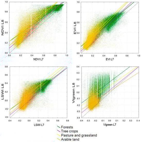These differences also suggest that the higher variability within vegetation indices values occur within areas characterized by low vegetation indices values and thus for areas with a low percentage of vegetation cover. Figure 6 shows different trends according to the land use type and vegetation index. The OLI NDVI is always higher than the ETM+ NDVI in all land uses, with higher differences for pasture and arable land and a decrease for tree crops and forests. This may suggest that the greatest differences of index values are related to low biomass content (pastures and arable land), whilst lower differences are related to the high value of biomass content. In particular, pasture, arable lands and tree crops show a regression function with a slope almost parallel to the 1:1 line, and forest land use shows the largest differences for lower NDVI values. With the increase of the index value, there is a constant reduction of the differences between OLI and ETM+ derived indices. The EVI shows the same trends described for NDVI and for indices based on the normalized difference of infrared bands (LSWI in Figure 6). VIgreen, based on visible bands (green and red), shows the greatest differences for land use classes characterized by high values of vegetation cover (forests) with differences nearly constant. This confirms the existence of differences due to SBDE between the two sensors in the visible range, especially with respect to the red band. For arable land, the trends of the index are different because OLI is higher than ETM+. For low index values, the increase of the VIgreen values ETM+ is higher than OLI ones due to a greater absorption in OLI red band together with the intensification of the vegetation cover.