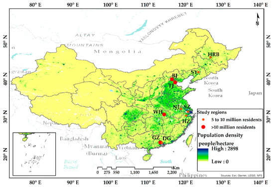 Several essential characteristics were used to decide this study’s area based on official Chinese census data from 2016, including (a) large population (over 5 million permanent residents), (b) regional terrain and climate, (c) frequent heatwaves over the decade, and (d) Landsat 8 data availability. Thus, the target includes Beijing (BJ), Dongguan (DG), Guangzhou (GZ), Hangzhou (HZ), Harbin (HRB), Nanjing (NJ), Shenyang (SY), Suzhou (SZ), Tianjin (TJ), and Wuhan (WH), as shown in Figure 1.