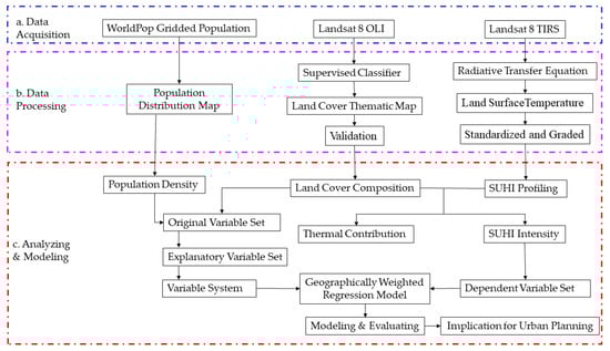 A general process for multi-city analysis of the SUHI footprint in Chinese megacities is implemented as shown in Figure 2. Three stages—(a) data acquisition, (b) data processing, and (c) analyzing and modeling—are designed. The specific technical methods and processes are illustrated as follows: