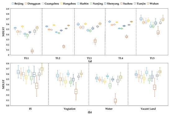 Next, we observed temperature distributions in relation to land cover using boxplots (Figure 4b). On the whole, surface temperature distribution and patterns of land cover in the ten megacities are similar. As shown in Figure 4, the highest temperature always falls under the category of IS, whereas vegetation and/or water are also manifest, consistent with the comparative analysis based on the mean NDLST values of each type of land cover. The temperatures of non-IS surfaces are more intense and closer to the mean NDLST values than those of ISs. However, Suzhou’s temperature pattern is more distinctive than those of the other cities because of the large proportion of water and internal heterogeneity of the land surface.
