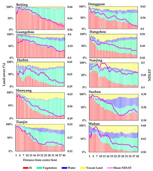 Based on the conceptual model of SUHI, we identified SUHI magnitude across the megacities using the urban-rural gradient model and compared its extent in each city using MURI. Forty concentric zones emerged in each study region, with the urban center as the origin and 1 km intervals between zones. We computed and profiled the composition proportions of land surface cover and the mean NDLST values based on each concentric zone. The results from the SUHI assessments show that the patterns of the mean NDLST values are generally identical to the tendency of ISs and are significantly impacted by non-ISs (Figure 5). The mean NDLST values increase because of the accumulation of ISs and bare soil, whereas the substantial growths of green space and water mitigates the heat effect. Although the overall thermal pattern diffuses from the city core to the surrounding rural areas, the peak values of surface temperature are not always distributed in the urban center.