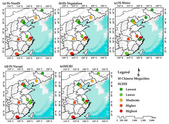 Variations in the SUHI footprint in ten megacities: (a) IS _NonIS (), (b) IS _Veg (), (c) IS_Water (), (d) IS_Vacant (), and (e) MURI.