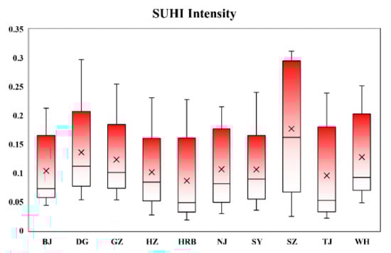 The SUHI footprint varies substantially under different methods. The mean NDLST values of land cover and MURI for all megacities are plotted in Figure 6. We categorized all megacities into five groups using the Jenks Natural Breaks Optimization method [79], representing each SUHI index from lowest to highest. Among varying SUHI footprints, Dongguan, Guangzhou, and Suzhou always presented an intense UHI, whereas the UHI effects in Harbin and Shenyang were relatively lower than those of other megacities. We graphed the different SUHII estimates with box-and-whisker plots to avoid bias regarding SUHII (Figure 7). According to the interquartile range, as well as the median and mean values of the boxplots, Suzhou has the strongest SUHI, while Harbin’s SUHI is weaker than in other cities. Figure 8 presents the SUHI footprint for all megacities, summarized and visualized on the basis of the mean and median values.