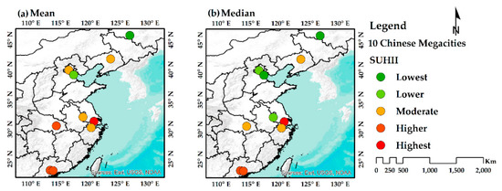 The grade of SUHI footprints in ten megacities by the mean and median values: (a) mean values, and (b) median values.