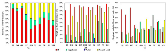 We also ranked the temperature difference between IS and non-IS () in each city: Harbin (0.0453), Tianjin (0.0523), Nanjing (0.0681), Beijing (0.0711), Shenyang (0.0741), Hangzhou (0.0765), Wuhan (0.0921), Guangzhou (0.0937), Dongguan (0.1003), and Suzhou (0.1620). However, the maximum differences between IS and vegetation or vacant land are both from Dongguan ( 0.1171; 0.0537, respectively), and the maximum value of is in Suzhou (0.2783). In contrast, we obtained the minimum values of from Tianjin (0.0437), Hangzhou (0.0842), and Harbin (0.0186), respectively. This implies that various kinds of LCC play diverse roles in different thermal environments.