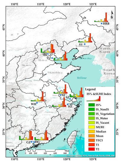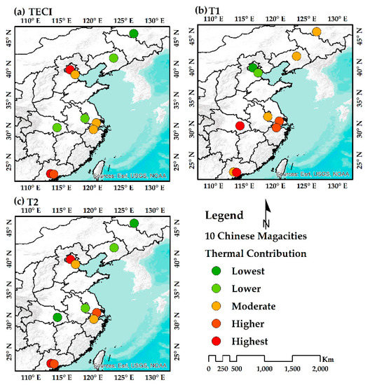 Different types of land cover exhibit unique functions and behaviors in each megacity. T2 reflects the extent of SUHI resulting from different land cover behaviors across the entire regional scale. Because of the consideration of all land cover proportions, the IS does not present a very high T2 value compared to the TECI and T1 values. In some study regions, entire land surfaces were accounted for by vast expanses of bare land and cropland, resulting in higher T2 values in terms of vegetation and vacant land that are associated with higher heat flux through bare or semi-bare surfaces. Examples include, Hangzhou, Harbin, Shenyang, Nanjing, Tianjin, and Wuhan. Water still makes a minor contribution to the entire regional thermal effect.
