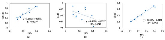 TECI, T1, and T2 values of IS for ten megacities: (a) the TECI distribution of IS, (b) the T1 distribution of IS, and (c) the T2 distribution of IS.