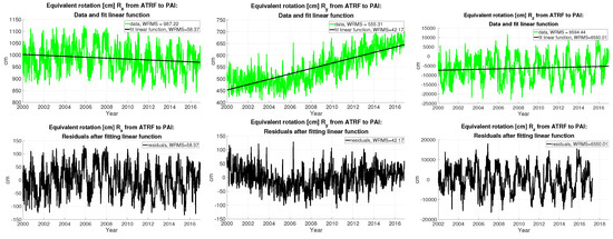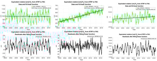The results derived from the RL06 CSR Stokes coefficients with monthly resolution: (top) equivalent rotations [cm] , , and from ATRF to PAI frame (in green, from left to right) and fit linear functions (in black); and (bottom) the residuals are also given in [cm].
