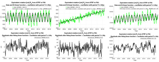 The results derived from the RL06 CSR Stokes coefficients with monthly resolution: (top) equivalent rotations [cm] , , and from ATRF to PAI frame (in green, from left to right) and fit linear functions plus annual oscillations (in black); and (bottom) the residuals are also given in [cm].