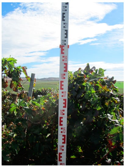 Vineyard height validation using point cloud classification was carried out using 40 on-ground validation randomly points distributed and georeferenced during each field and UAV flight. A photograph with the branch of the vine and a ruler was taken to measure the grapevine height at the 40 on-ground points (Figure 3). Then, the measured on-ground heights were compared to the estimated heights from the classified point clouds. For this purpose, for each position measured for every field and date, the nearest points belonging to the terrain and vegetation classes were located in the classified point cloud to later calculate the value of the height of every grapevine. The coefficient of determination () derived from a linear regression model and the root-mean-square error (RMSE) of this adjustment were calculated using R Commander software [] taking into account each UAV flight independently and jointly in order to analyze the quality of the adjustment.