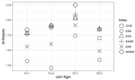 M-Statistic values for each UAV flight per Field (A and B) and month (1: July and 2: September).
