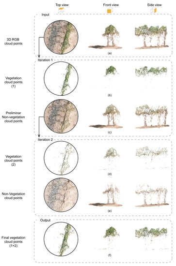 An example of the results obtained from the point cloud classification process: Cloud points: (a) 3D RGB, (b) vegetation points, (c) preliminar non-vegetation, (d) vegetation points, (e) non-vegetation, (f) final vegetation points.