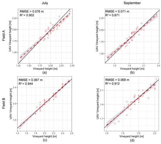 UAV vine height versus measured vine height by field and date and 95% confidence interval. The red line is the fitted linear function and the black line represents the 1:1 line. The root-mean-square error (RMSE) and the coefficient of determination (R2) derived from the linear regression fit are included (p < 0.0001). Field A: (a) July and (b) September, Field B: (c) July and (d) September.