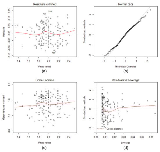 Residual analysis of the linear model of UAV estimated and on-ground measured vine heights: (a) residuals vs. fitted values, (b) normality of residuals, (c) scale–location, and (d) leverage vs. residuals.