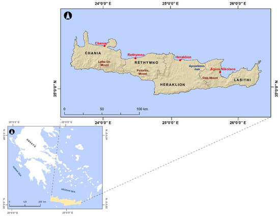The island of Crete is located in the southern part of Greece (Figure 1), having a distance of 160 km from the Greek mainland. It separates the Aegean Sea from the Libyan Sea and is surrounded by numerous smaller islands including Gavdos, the southernmost Greek and European border. With an extent of 8257 km2 (about 6% of the total area of Greece), length of 260 km, and width ranging from 12 km to 57 km, Crete constitutes the largest Greek island and the fifth largest in the Mediterranean region. Administratively, it is divided into four prefectures from west to east: Chania, Rethymno, Heraklion, and Lasithi (Figure 1). According to the official 2011 census [15] held by the Hellenic Statistical Authority (ELSTAT), Crete is the most populated Greek island with 623,065 inhabitants (5.8% of the total population of Greece). As a result of significant increase in urban and touristic activities over the last two decades, the majority of them are concentrated in coastal areas [16].