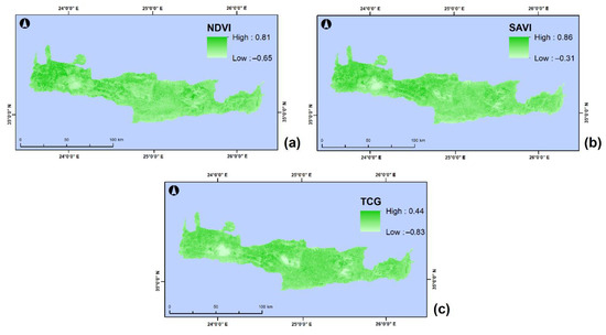 In addition, it can be noted that a significant part of the previously described gain and loss of vegetation amount for the relative time periods was marked as less intense and was mostly “translated” as biomass variations (or moisture reduction) from the combination of TCG–TCB. This trend also appeared from the combinations of NDVI–albedo and SAVI–albedo in order to indicate much of vegetation loss within the period 2009–2019.