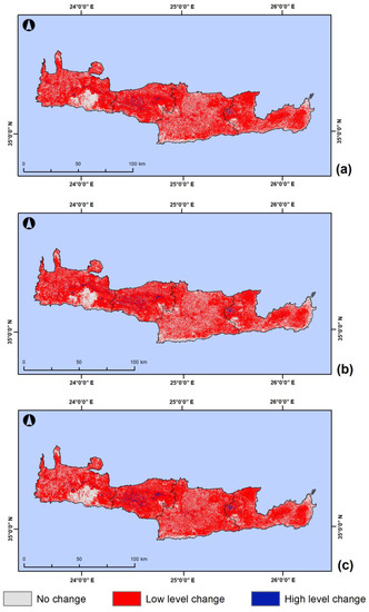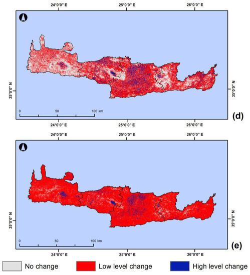 In the period between 2009 and 2019, the extent of low-level changes increased covering an extremely large part of the study area (87.60%, approximately 7234 km2). A much smaller part (5.91%, about 488 km2) covered by a slightly increased extent of high-level changes was also observed in Heraklion prefecture, with large areas on Lefka Ori and Psiloritis Mounts.