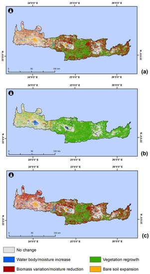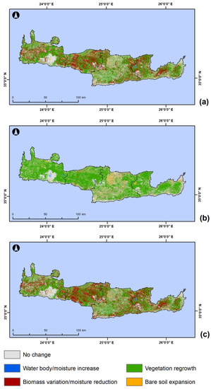 In the same period, the part of the study area presenting vegetation regrowth was notably decreased (new percentage equal to 27.20%, approximately 2246 km2) reaching the extent of the part with biomass variation/moisture reduction (new percentage equal to 27.43%, approximately 2311 km2). This change type was limited in the Heraklion prefecture. On the other hand, the part presenting bare soil expansion increased (new percentage equal to 7%, approximately 532 km2) covering scattered areas in the Chania prefecture and large areas on the massifs of the island.