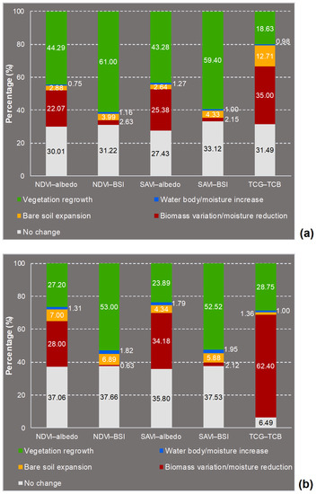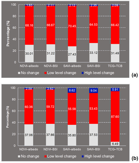 Moreover, in terms of the type of change, for the period of 1999–2009, the highest values of kappa index and overall accuracy were from the NDVI–albedo. The SAVI–albedo, SAVI–BSI, NDVI–BSI and TCG–TCB constituted the ranking of the other combinations. For the period of 2009–2019, the ranking of the combinations was found to be similar.