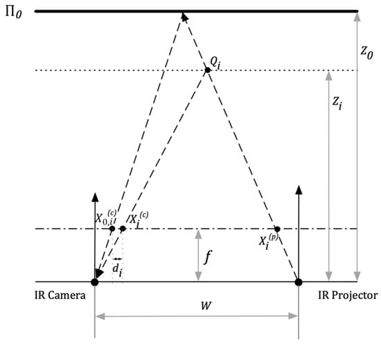 where is the distance between the camera and the projector; indicates the focal length of the infrared camera; and represents the distance between the plane and the sensor.