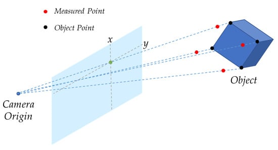 As shown in Equation (3), the and coordinates of each measured point are calculated based on the measured depth and the image coordinate . This means that if is fixed, for any depth measurement, the 3D point corresponding to will always be located on the radial direction line that starts from the camera origin and passes the image point . Therefore, in the 3D space, the measurement error of the SL-based RGB-D sensor is in the radial direction, as illustrated in Figure 4, in which the red point is the measured point, the black point is the object point, and the measurement error is the distance between the measured and the object point.