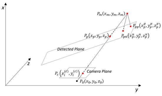 where is the location of the camera center , and illustrates the intersection point between the radial line and the detected plane. If we set to the original point of the coordinate system, can be calculated as