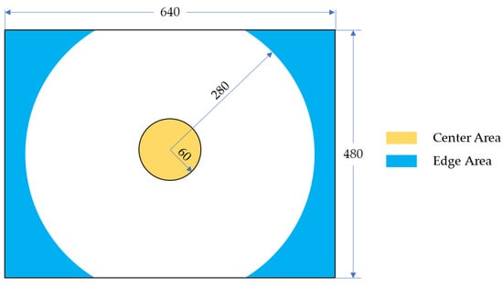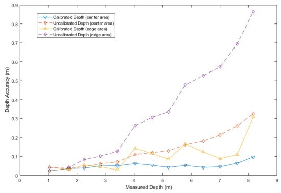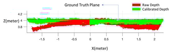 The effect of the calibration is demonstrated in Figure 7, where the projected point clouds of a plane wall for both uncalibrated and calibrated systems are plotted. The improvement in the calibrated depth can be clearly seen as the wall should be a straight line after projection to the floor. Additionally, the quantitative analysis of the depth calibration in the different operating ranges and different areas of the frame is shown in Figure 8. The illustration of the center area and edge area is shown in Figure 9. The accuracy of the depth measurement improved significantly with the calibration operation, especially for the far range and edge area.